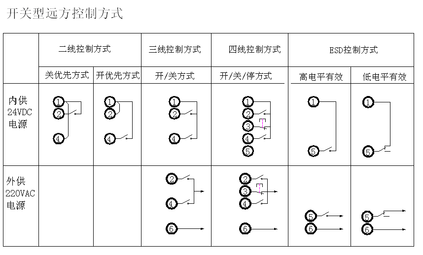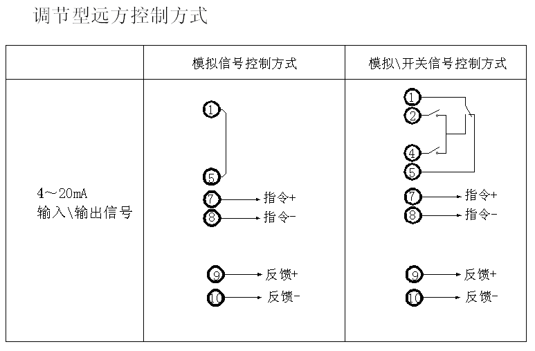 开关量或脉冲控制型(KX):有三个控制端子用于 开阀、关阀、停止/保持。远程控制可以连接成保持 或点动控制方式。控制接口是光隔离接口,带有24V 防浪涌功能。控制电源可以使用执行器内部提供的 正极进行开/关阀、负极接地的24V电源,或使用外 部提供的220VAC的电源。模拟量比列控制型(MX): 比列控制型使执行器能够按照模拟信号自动将阀门 定位,信号范围:4~20mA。可以对用户提供的非 标准信号进行认定,以使对应阀门的全开、全关位 置。可以对模拟信号丢失时进行保位、全开、全关 阀门进行组态。